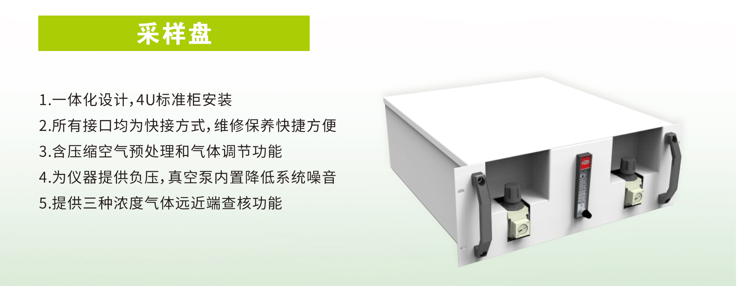 一體化設計,4U標準柜安裝;所有接口為快接方式,維修保養快捷方便;含壓縮空氣預處理和氣體調節功能;為儀器提供負壓,真空泵內置降低系統噪音;提供三種濃度氣體遠近端核查功能。